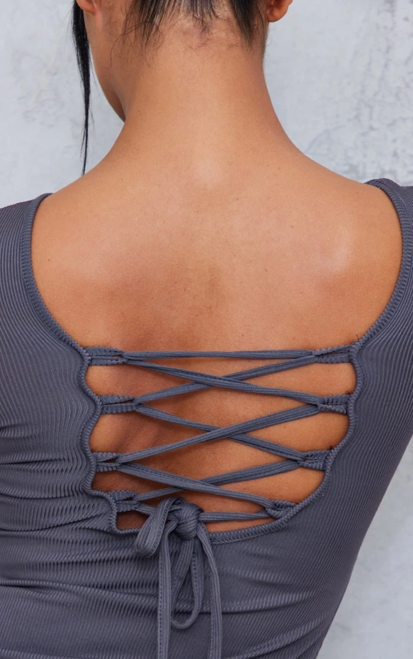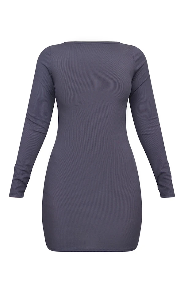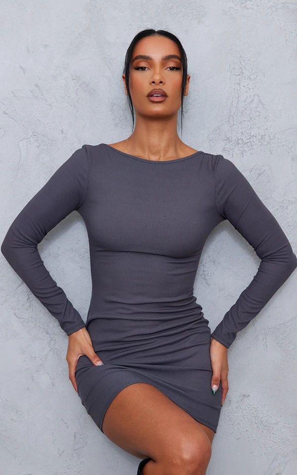 Robe moulante côtelée gris anthracite à dos lacé et manches longues