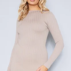 Robe moulante côtelée gris pierre à manches longues et contours structurés