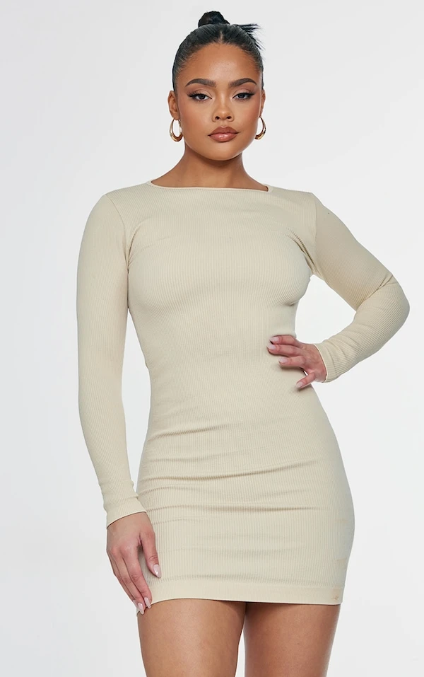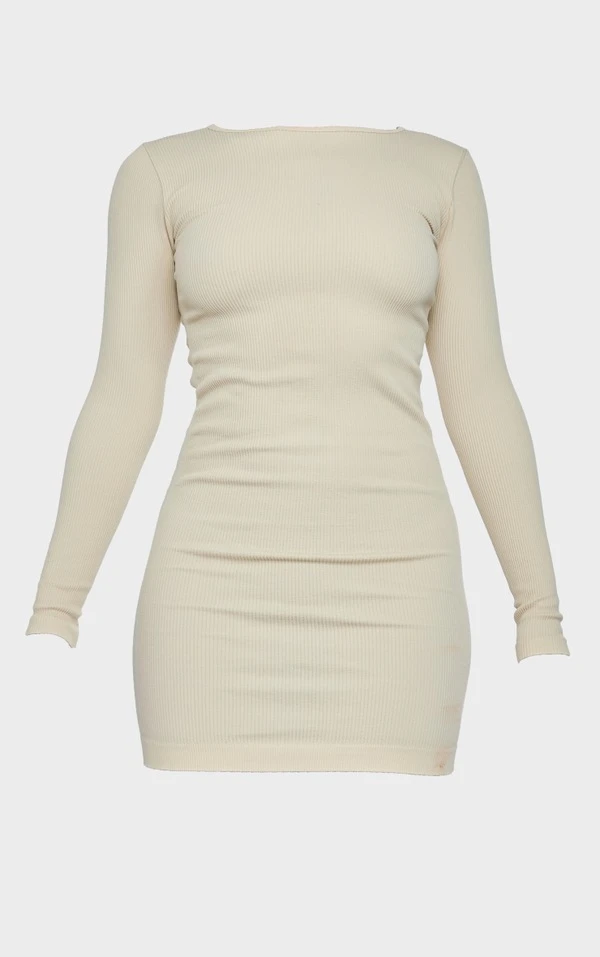 Robe moulante côtelée structurée sable clair froncée à détail contours