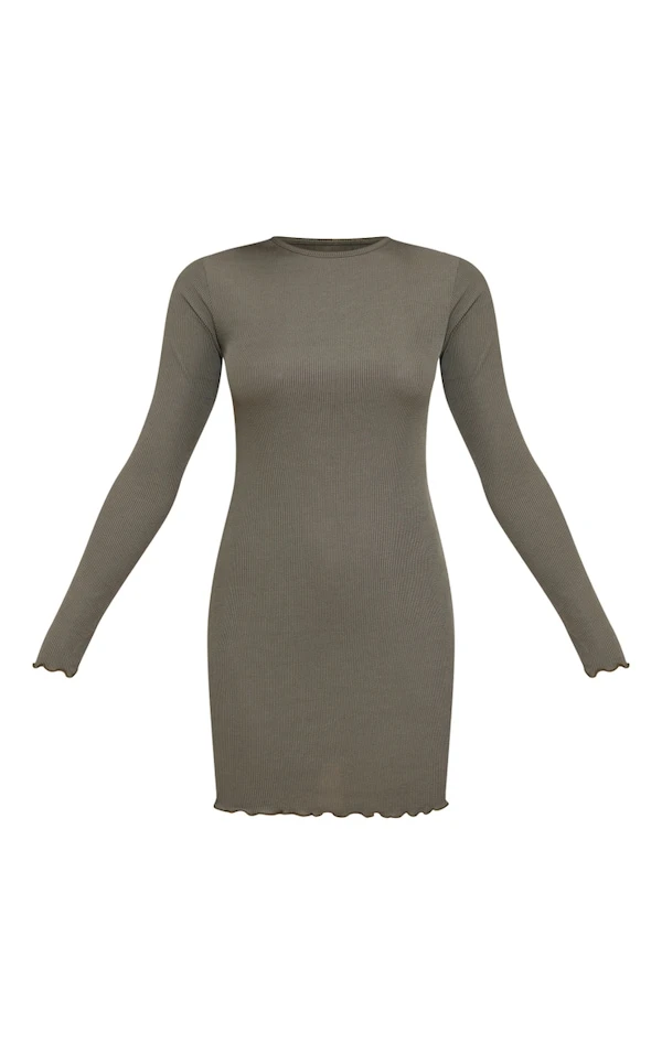 Robe moulante côtelée vert olive à col rond et ourlet légèrement volanté