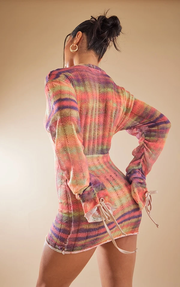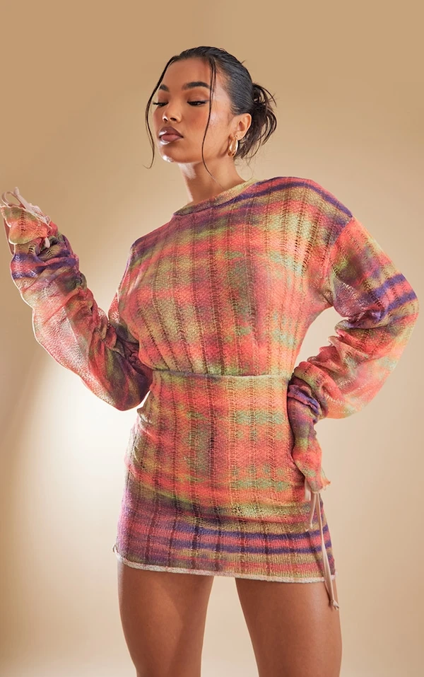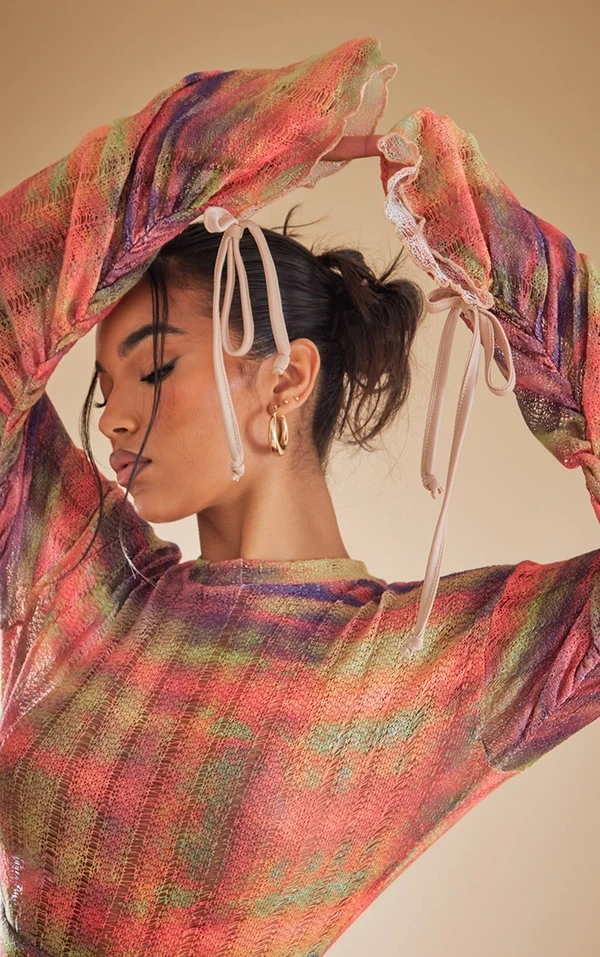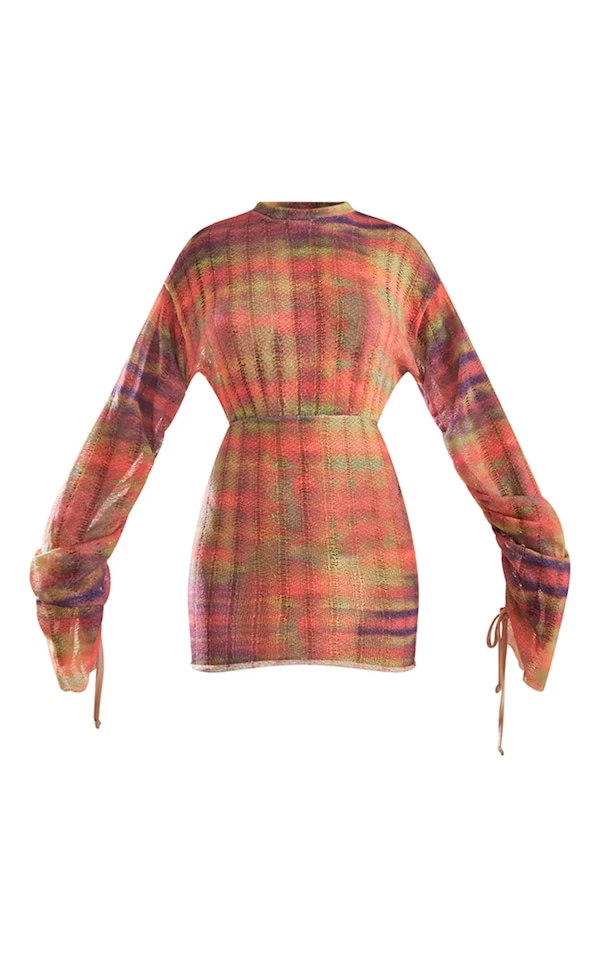 Robe moulante déchirée à imprimé flou orange et manches longues