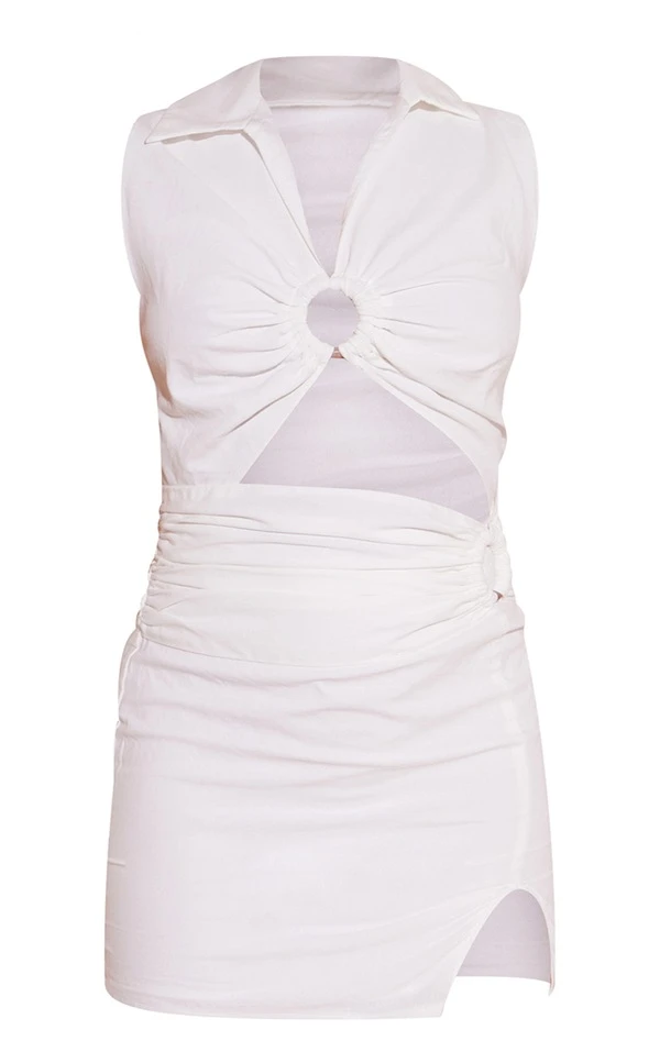 Robe moulante découpée effet lin mixte blanc à anneau en bois
