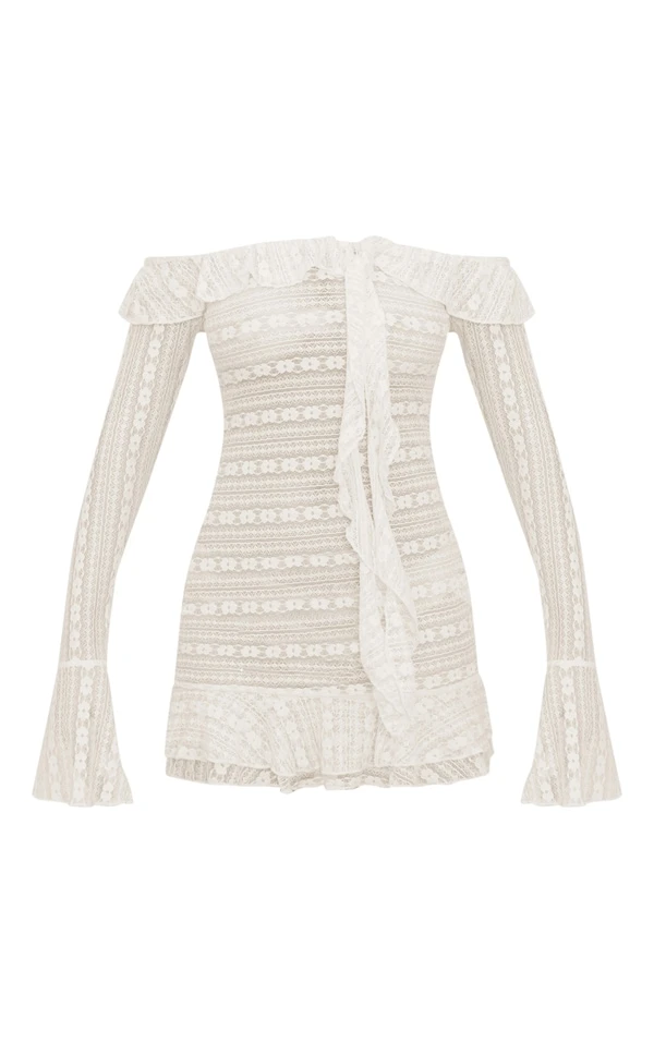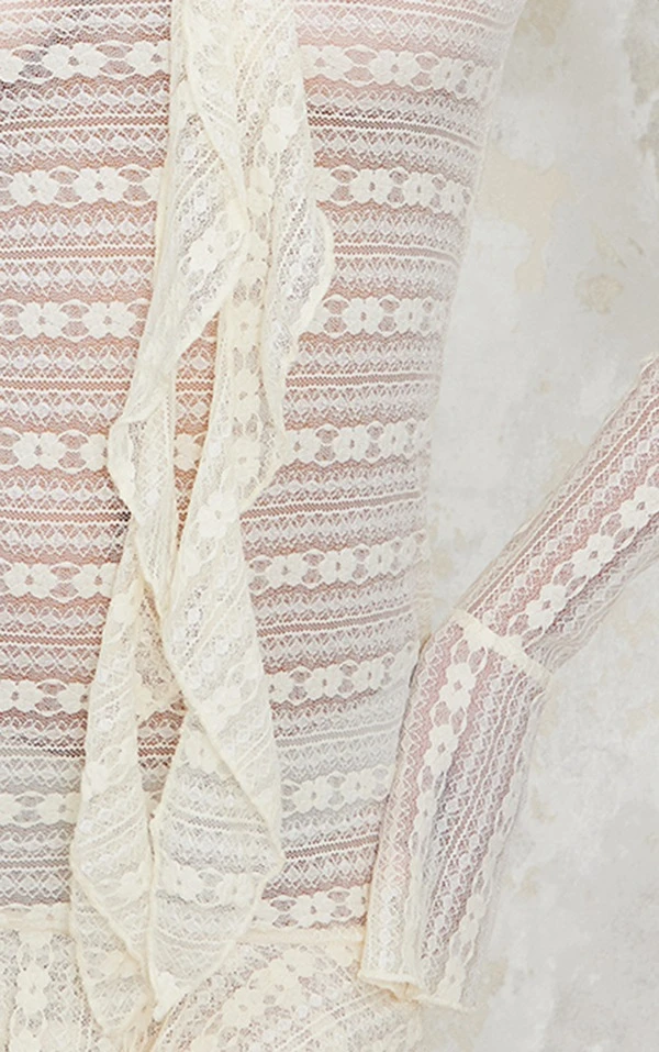 Robe moulante drapée en dentelle crème transparente à col bardot et volants