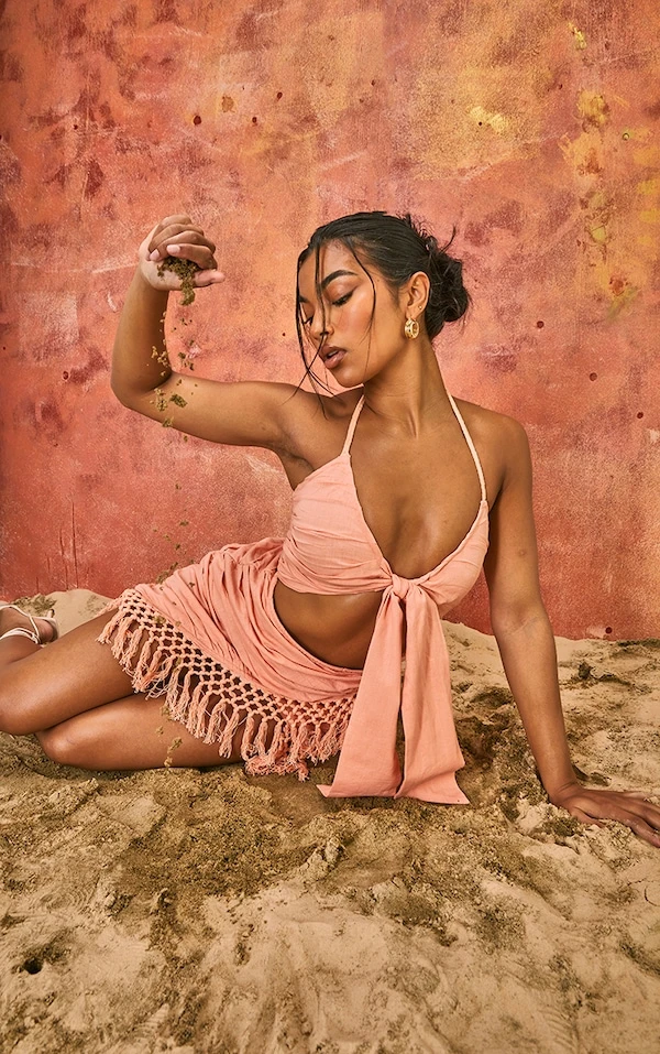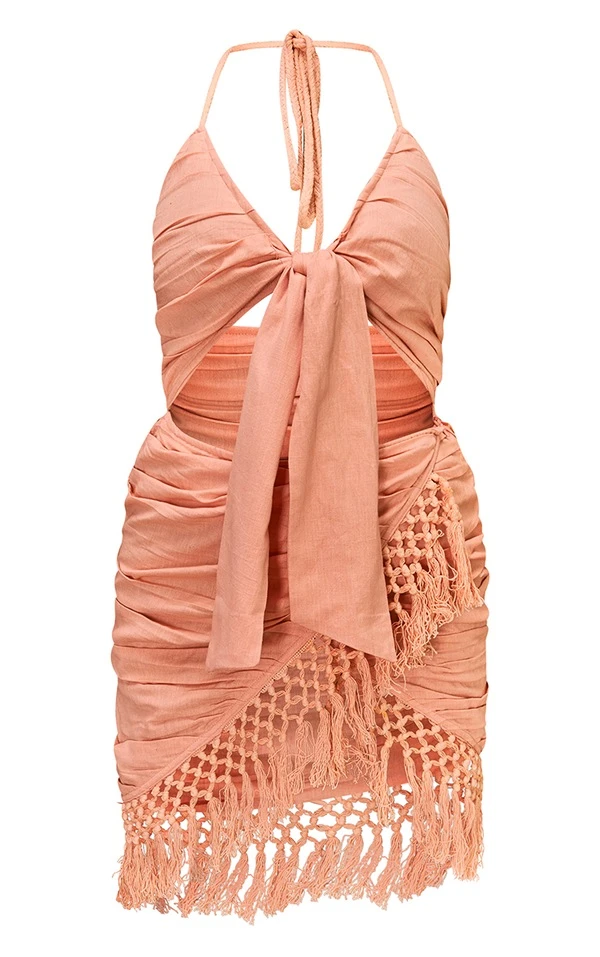 Robe moulante effet lin pêche à ourlet frangé et buste noué