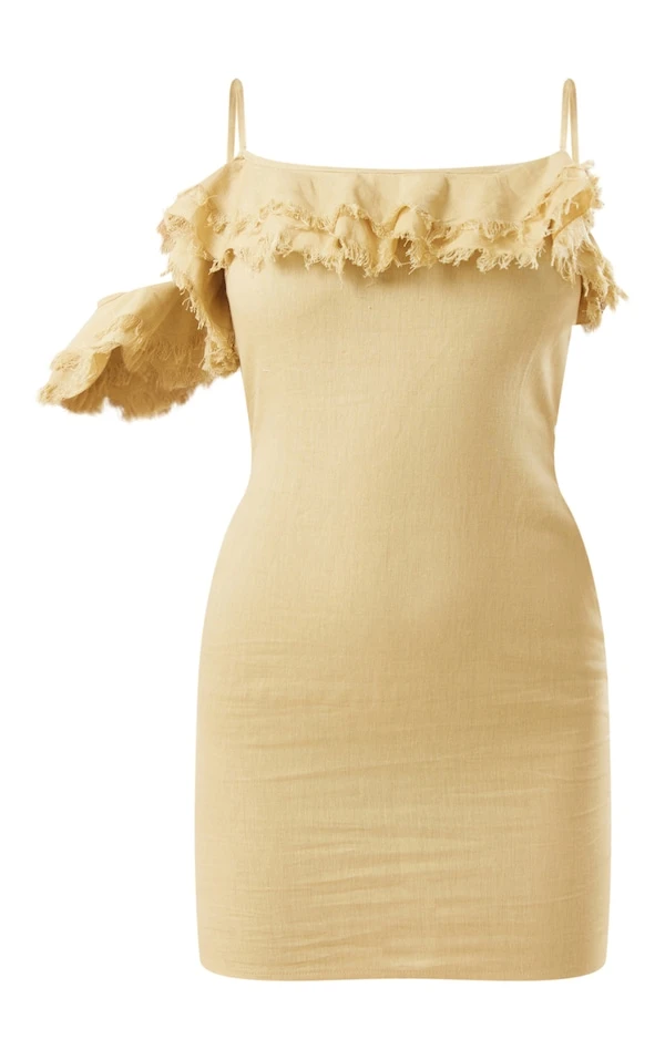 Robe moulante en effet lin vert sauge à bretelles et volants à ourlet élimé