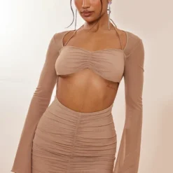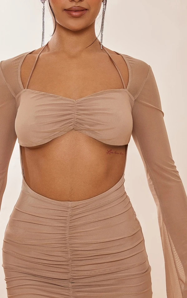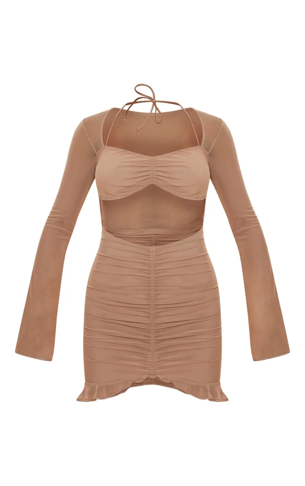 Robe moulante en mesh froncé café au lait rosé à manches longues et ourlet volanté