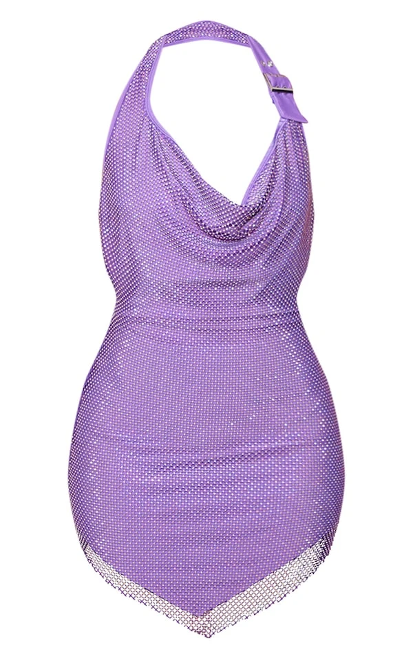 Robe moulante en mesh violet strassé à col bénitier et détail boucles