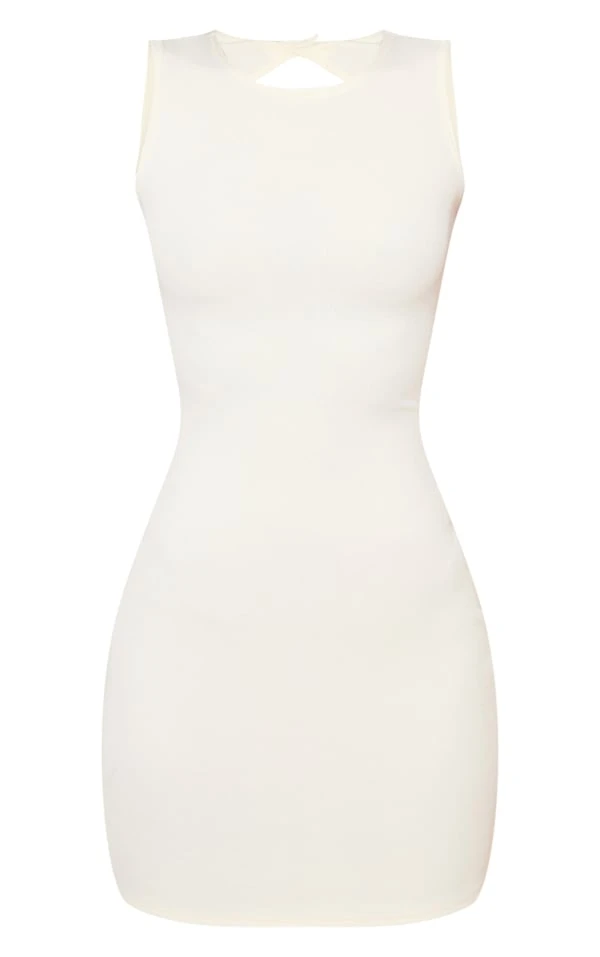 Robe moulante finement côtelée crème à découpes et nouée dans le dos