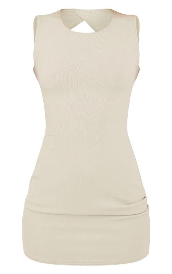 Robe moulante finement côtelée vert sauge à découpes et nouée dans le dos