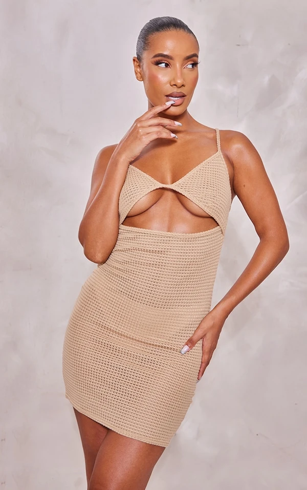 Robe moulante marron doux en maille tricot texturée à découpes et bretelles