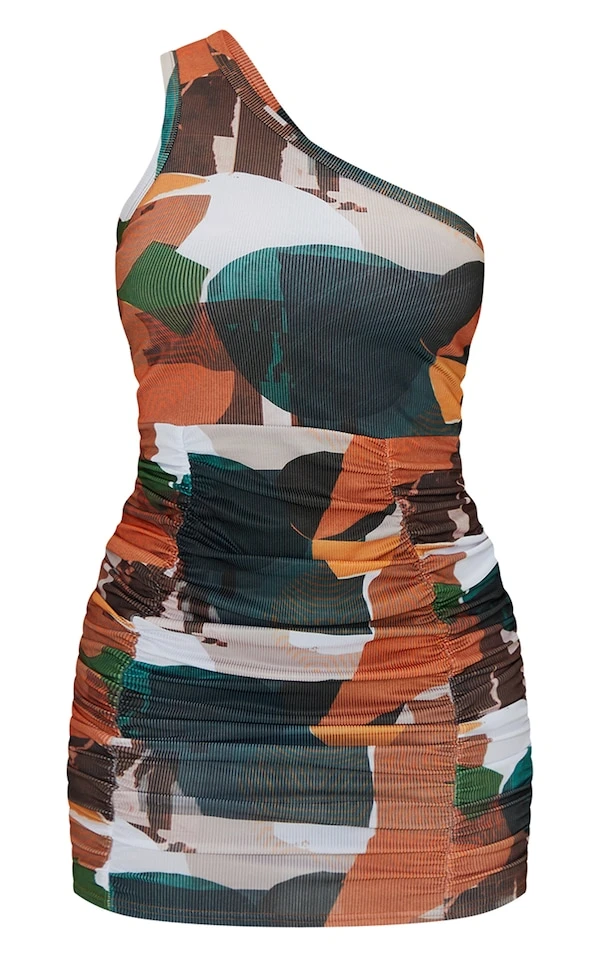 Robe moulante orange imprimé abstrait à bretelle unique et jupe froncée