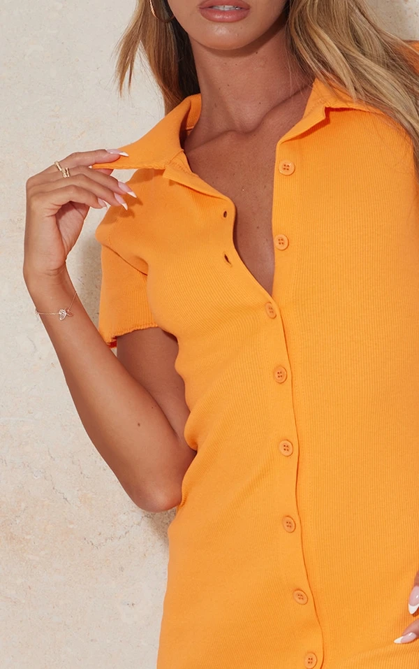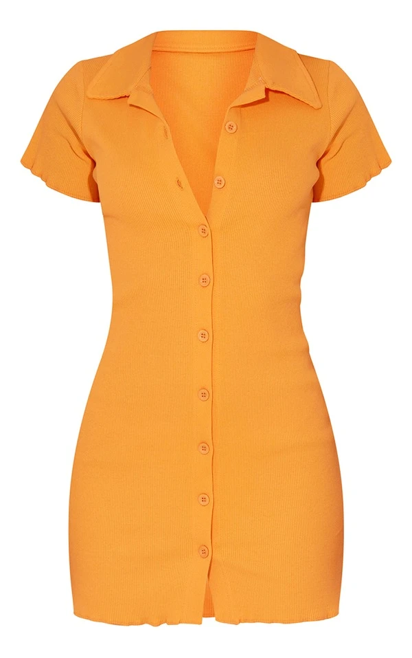 Robe moulante orange vif côtelée à col et ourlet ondulé