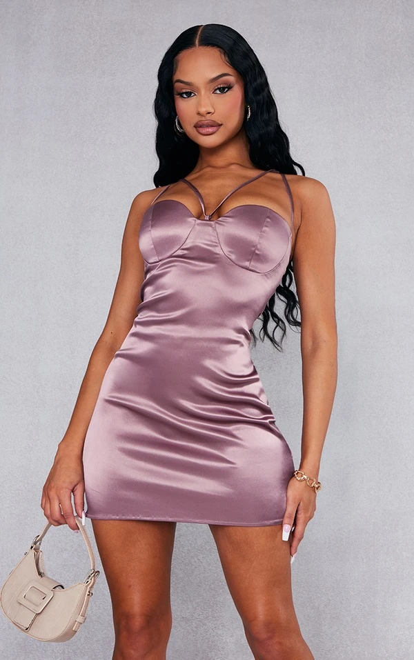 Robe moulante satinée mauve foncé à bretelles et détail bonnets
