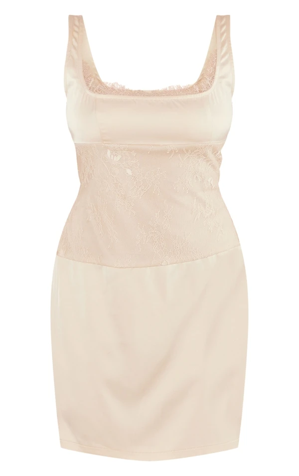 Robe moulante satinée nude à parties en dentelle et bretelles