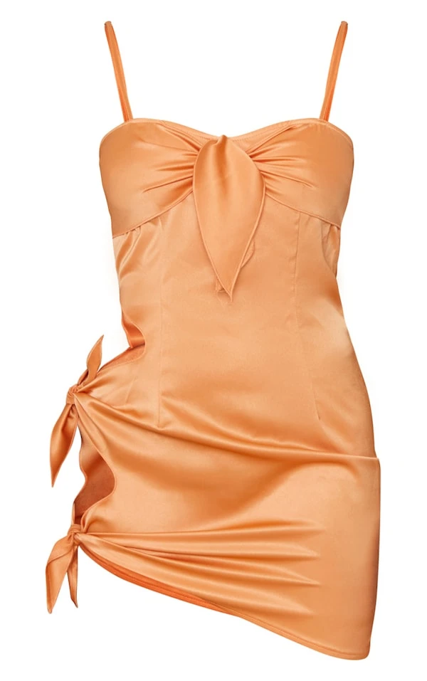 Robe moulante satinée orange à découpes nouées et bretelles
