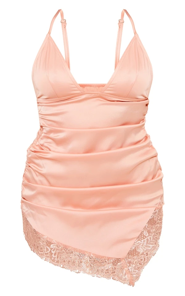 Robe moulante satinée pêche décolletée à bretelles et dentelle