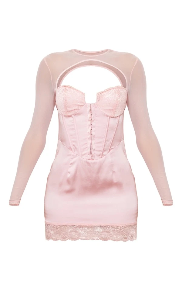 Robe moulante satinée rose à manches en mesh détail crochets & oeillets et dentelle