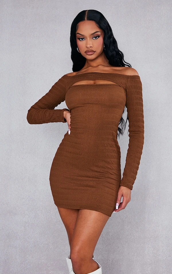 Délicieusement stylée dans cette robe à la coupe moulante ! Son effet texturé est très canon et on adore son coloris chocolat et son col bardot découpé. Pour un look de soirée très stylé, c’est à porter avec une paire de talons hauts et des créoles larges.