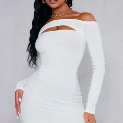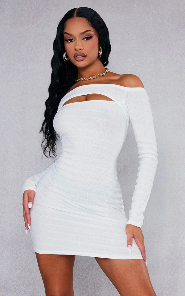 Robe moulante texturée crème à col bardot découpé