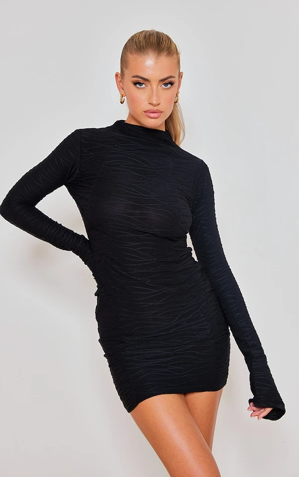 Robe moulante texturée noire à manches évasées