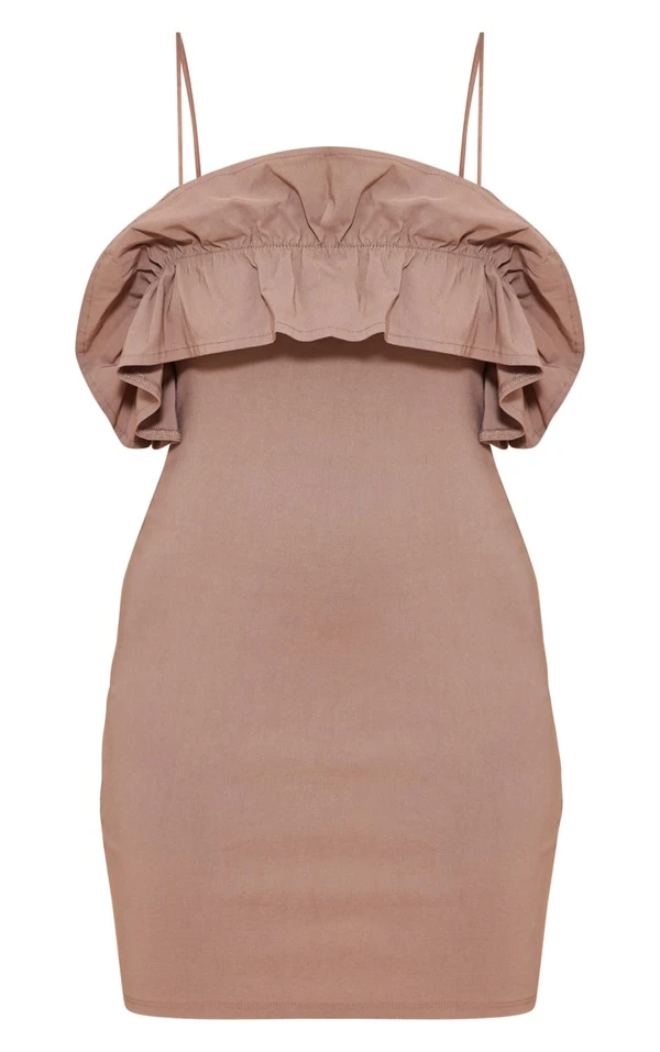 Robe moulante tissée stretch taupe à détail volanté