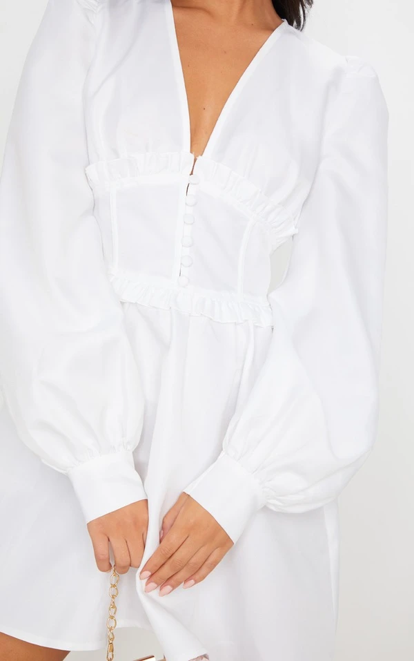 Robe patineuse en maille tissée blanche à boutons et manches bouffantes