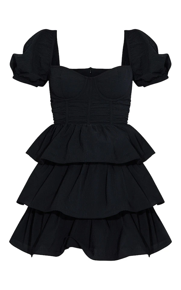 Robe Patineuse Noire Crêpée à Détail Bonnets Et Jupe étagée