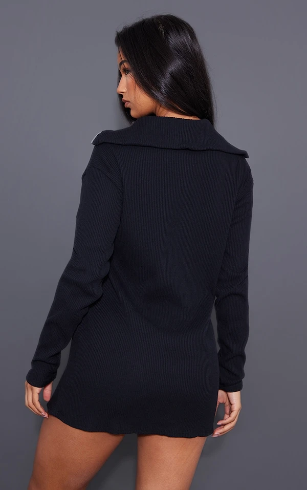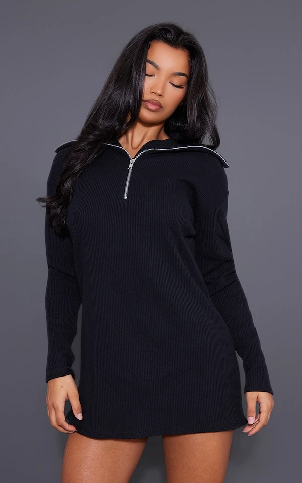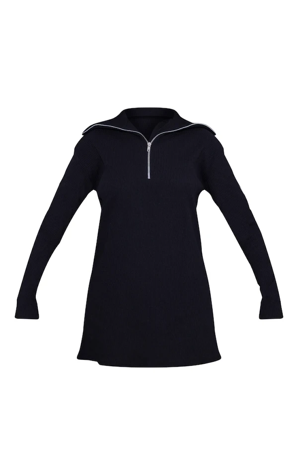 Robe pull oversize côtelée noire à col haut et demi-zip