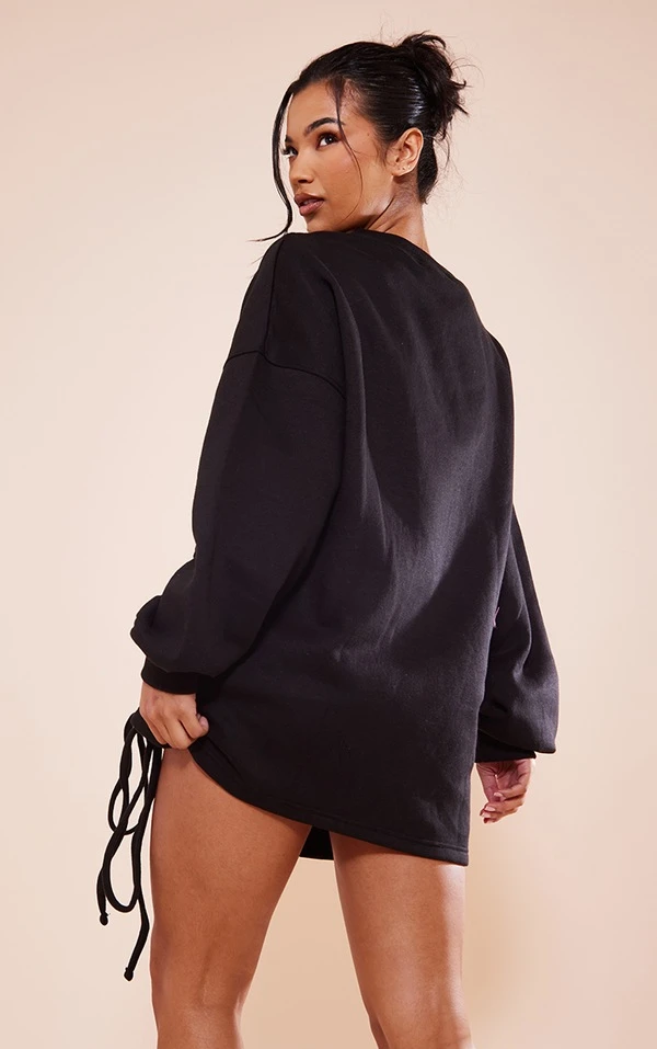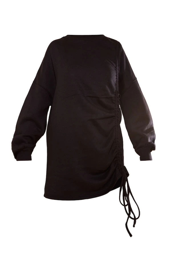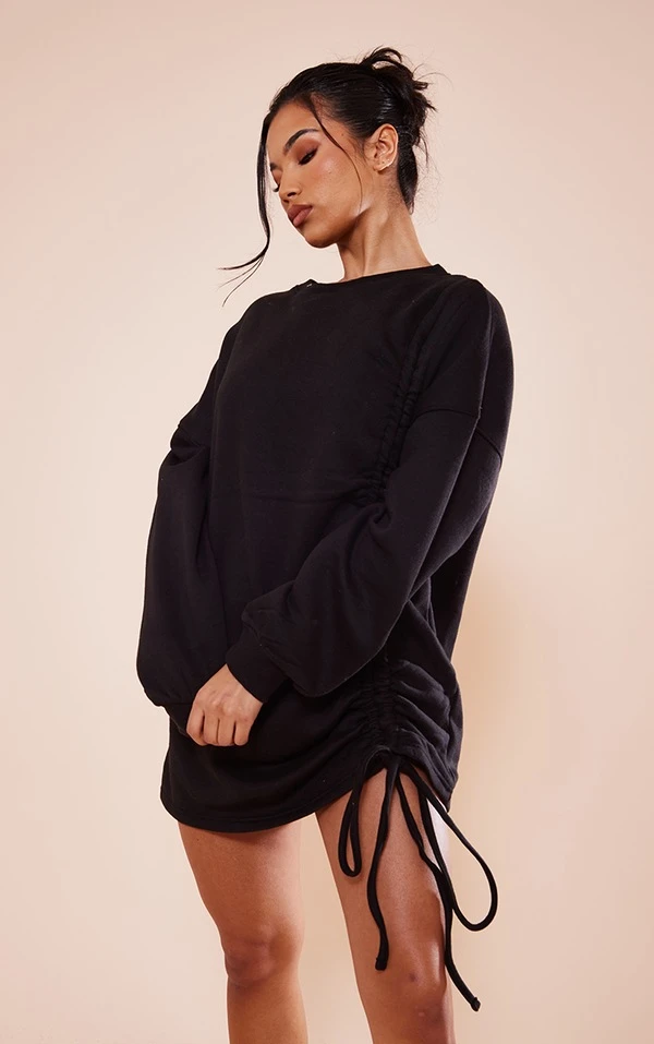 Robe pull oversize noire en sweat froncé à col ras