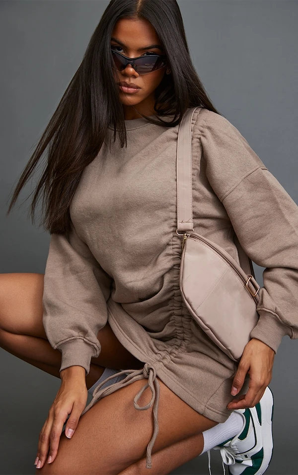 Robe pull oversize taupe en sweat froncé oversize à col ras