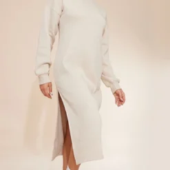 Robe sweat longue avoine à col montant et doublure en polaire