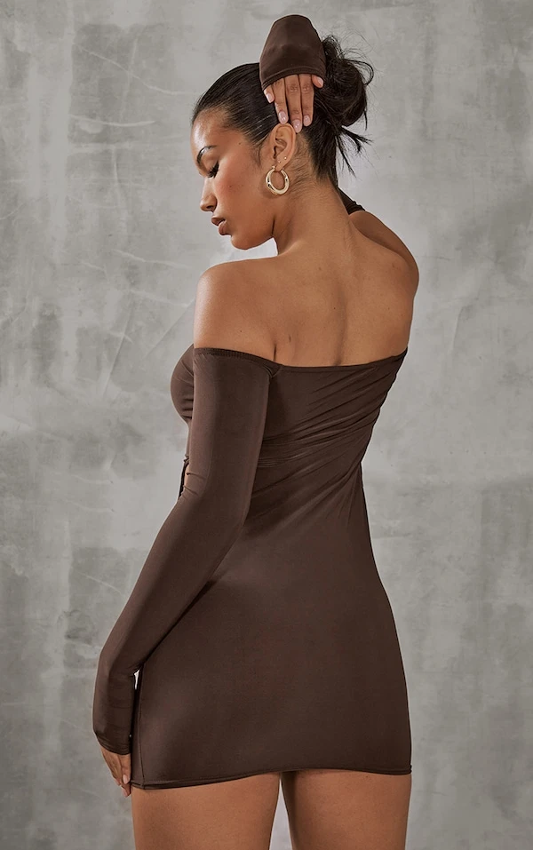 Robe très moulante chocolat à col bardot et découpes sur les côtés