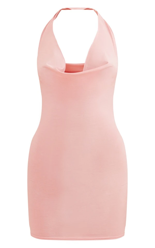 Robe très moulante rose pâle à ourlet légèrement volanté et dos nu