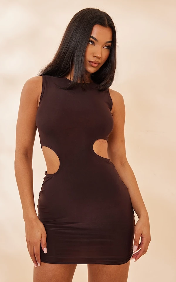 Robe très moulante sans manches chocolat découpée sur les côtés