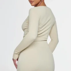 Robe Moulante Côtelée Gris Pierre à Corset Et Détail Coutures
