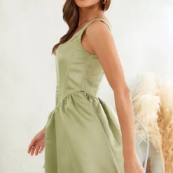 Robe Patineuse Satinée Vert Sauge à Col Carré Et Détail Corset